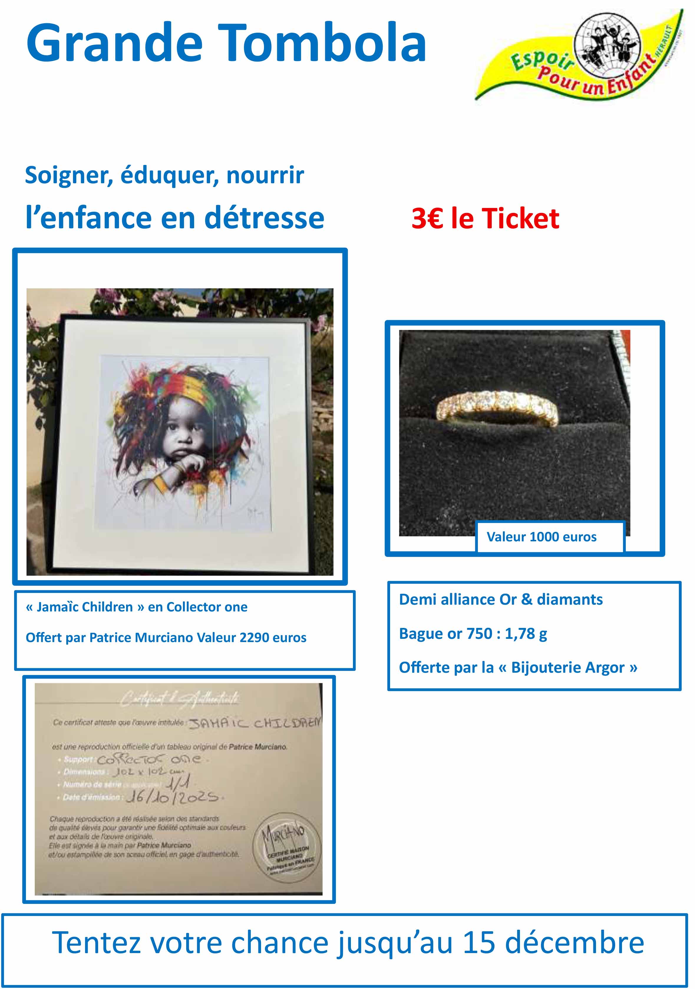 Nous organisons une Tombola en cette fin d'année 2025 afin de renforcer notre aide à l'enfance.
